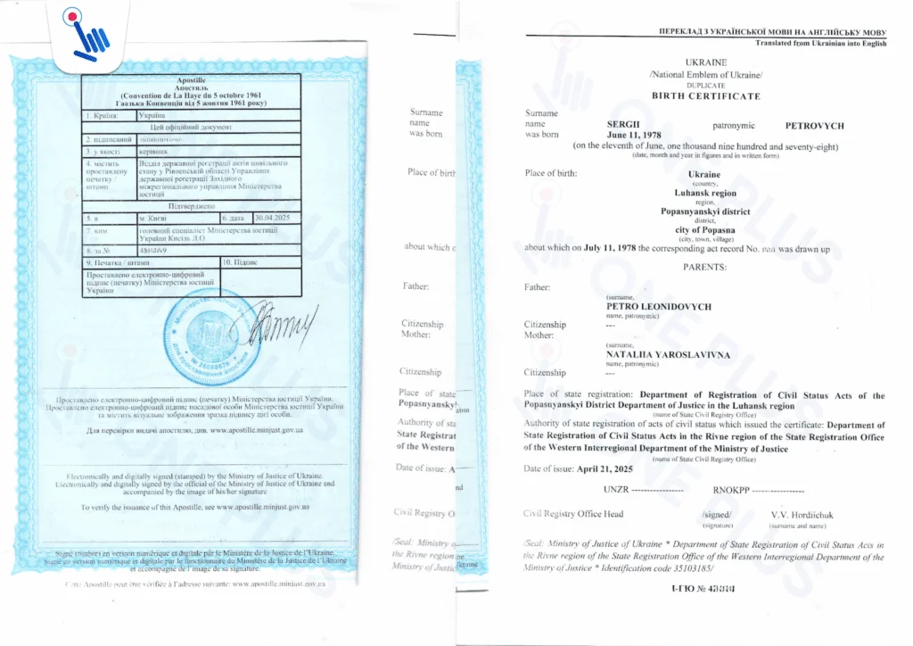 Как выглядит перевод дубликата вместе с апостилем свидетельства о рождении Украины