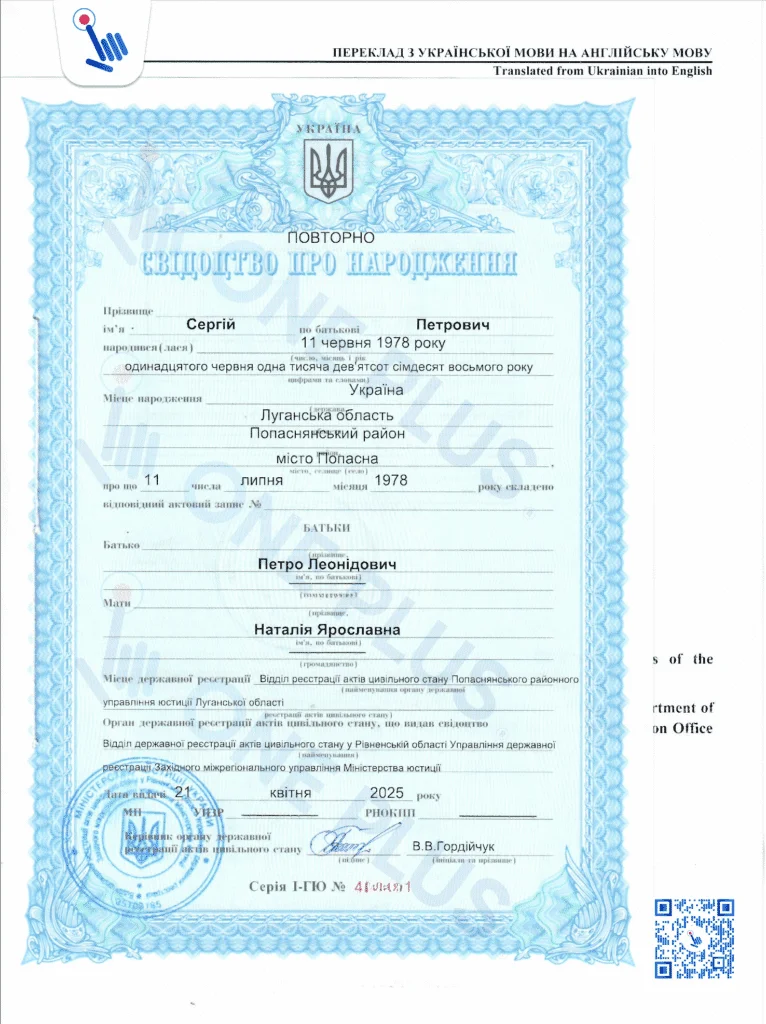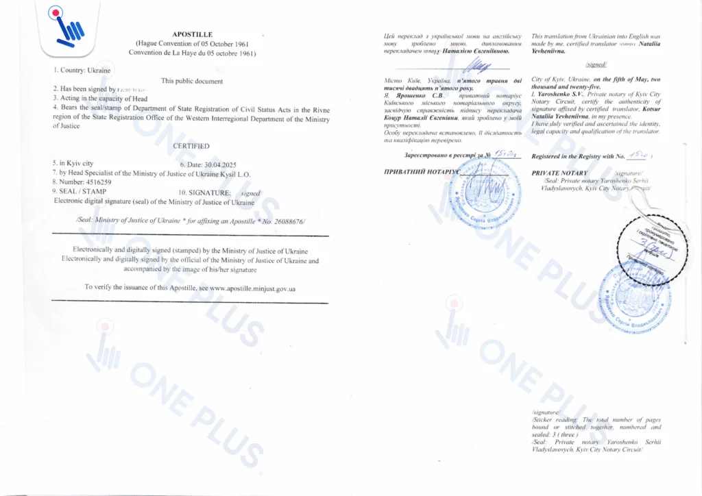 Наша юридическая компания ONE PLUS помогает оформить дубликат свидетельства о рождении удалённо и легализовать его для использования за границей — под ключ, без вашего личного присутствия в Украине.